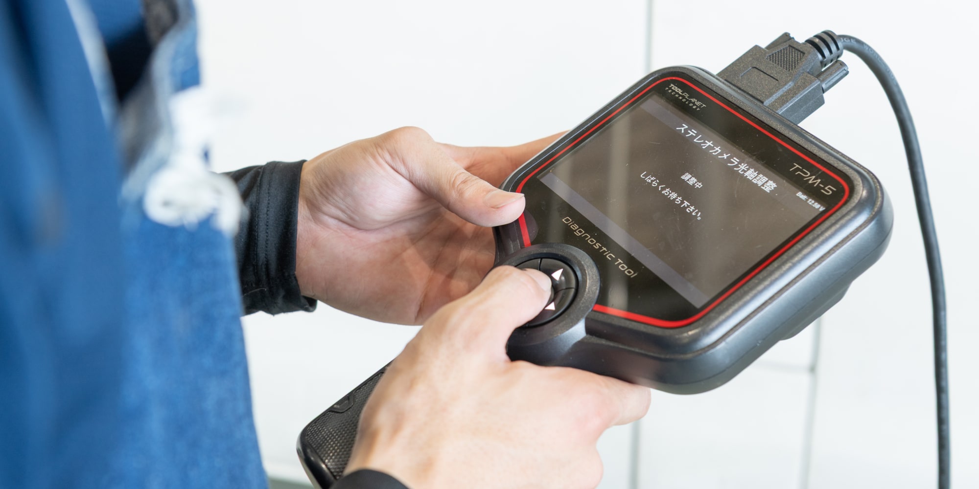 専用ツールで車両と接続し、カメラの調整作業を行います。