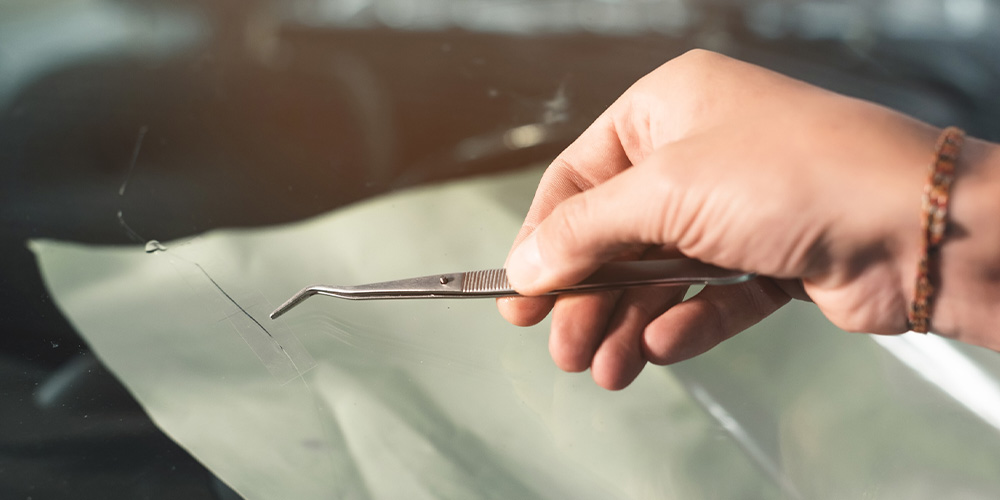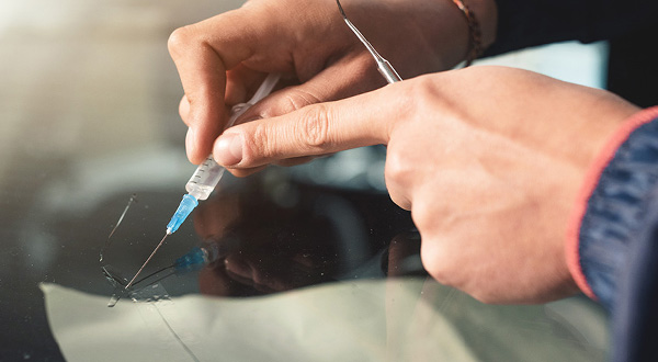 飛び石などで傷付いたガラスの修理には、ひび割れの中に入ってしまった空気を抜き、レジンを入れる作業を行います。